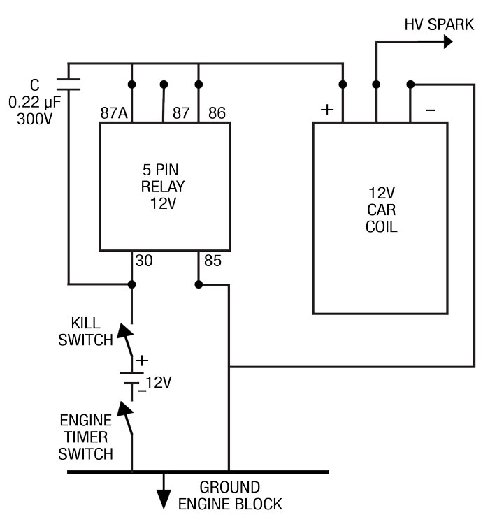 My design uses an automotive (transformer) coil, a capacitor (sometimes called a ‘condensor’), and a 5-pole automotive relay that is a single-pole, double-throw relay (SPDT) type. There is another simple approach which I will describe later.
