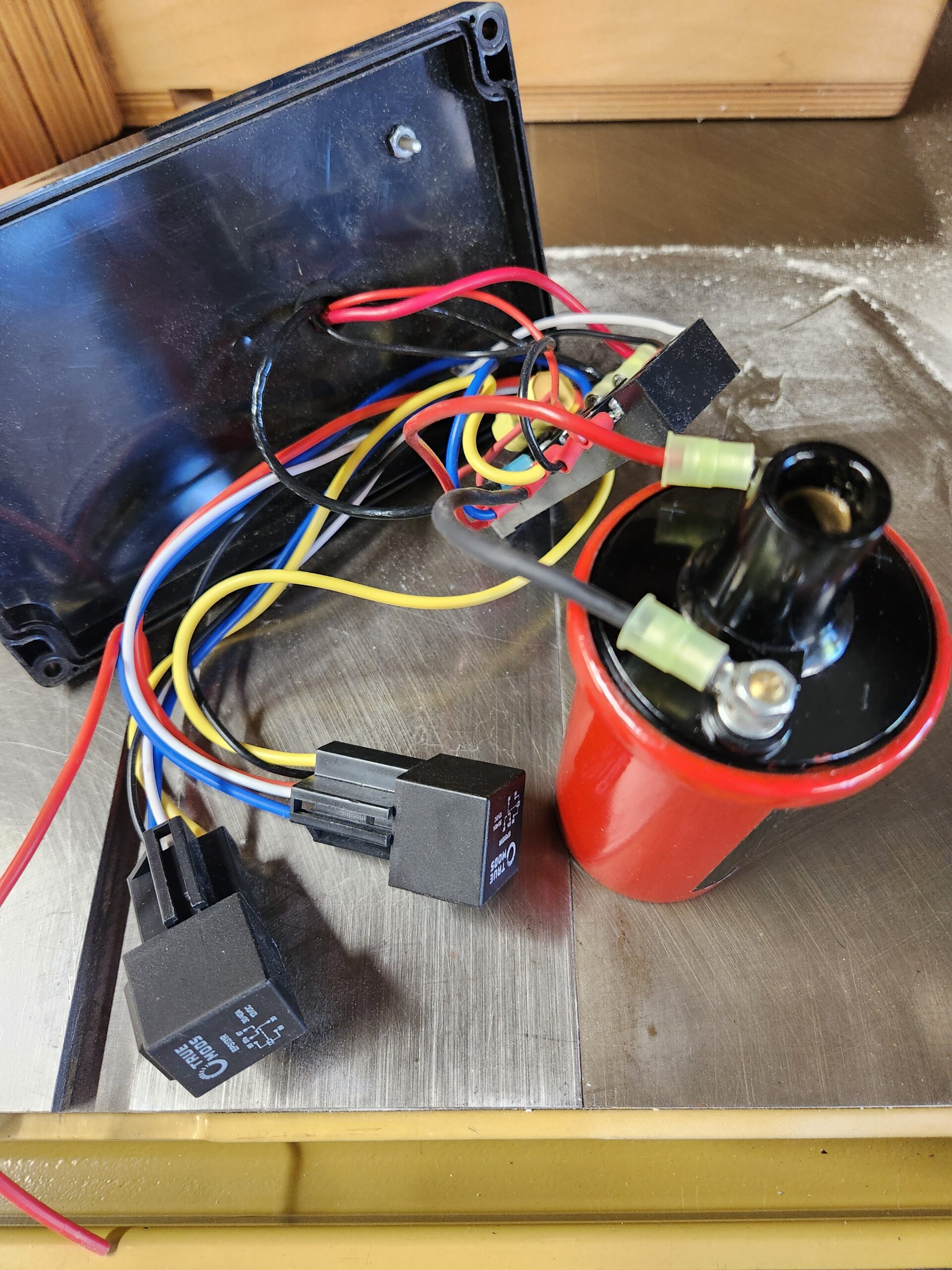 The circuit I used is very simple. When 12-volt DC power is applied to the relay pin marked ‘87A’ it will switch on and off at a rapid rate until the power is turned off. The relay will energize the automotive coil which in turn will fire the spark plug. As long as the relay is being energized, the coil will continue to produce sparks. This was advantageous to reliably firing the GALCIT replica engine with the liquid methanol and gaseous oxygen mixture. This simple system would most likely help others achieve ignition when other systems might fail. Below is a circuit diagram and a photo of the box I hurriedly made after our RRS team had trouble with the pyrotechnic firing approach. Only one relay was in the firing circuit, the other was a relay to control the circuit remotely from a separate battery.