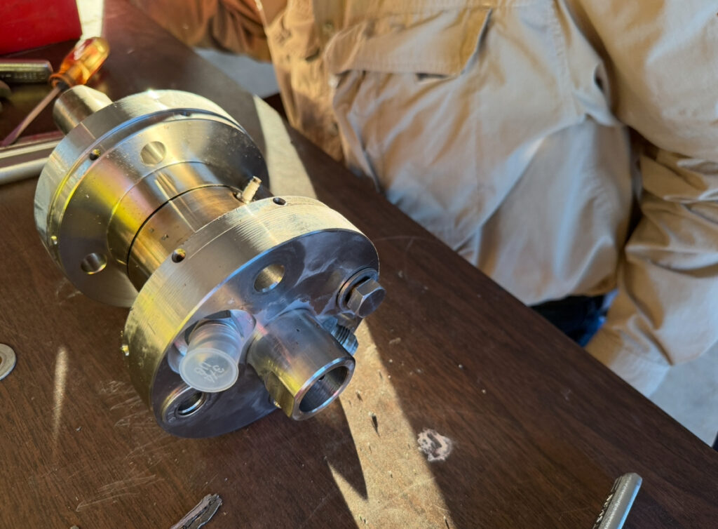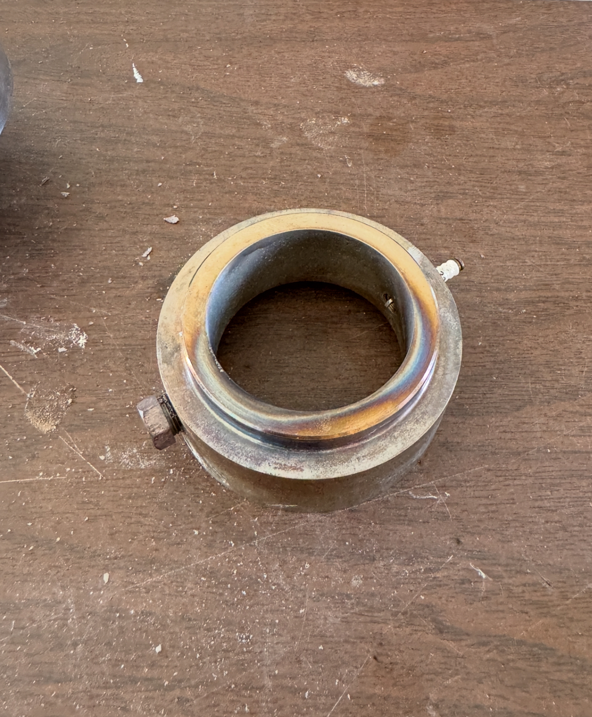 Below are some photos from the GALCIT replica engine in early June 2024 and how the sparkplug was mounted into the chamber interior. This is the middle ring of the modular slab engine design. We had one port drilled for mounting the sparkplug and the other tapped for a pressure gauge which we didn’t use (plugged).