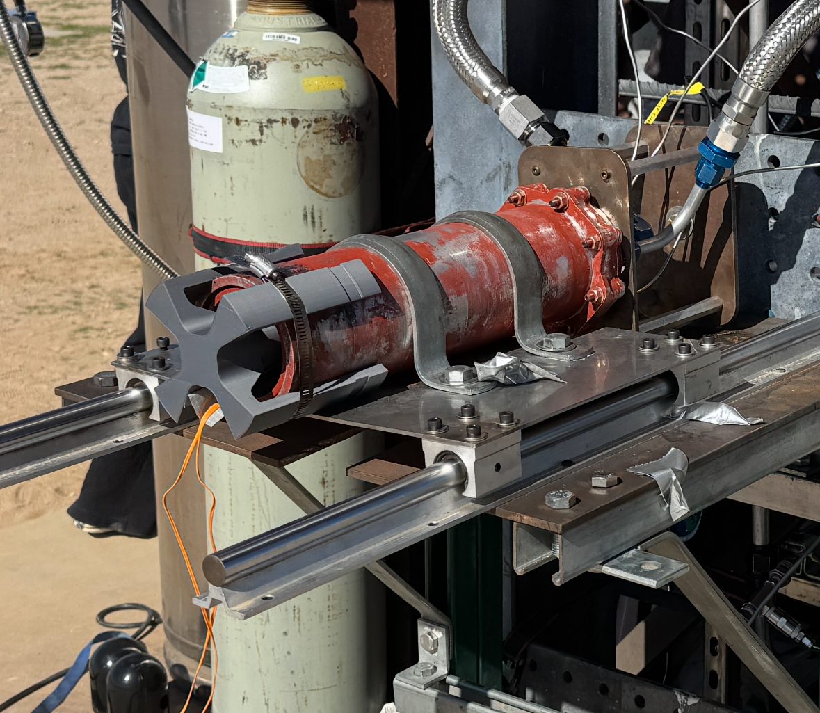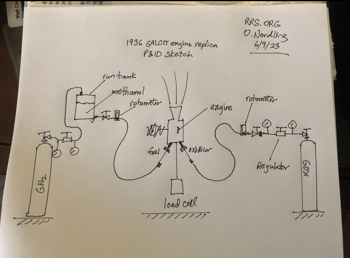 For some background, the GALCIT replica engine design was a simple single-port of injection, slab-type of early prototype engine design using liquid methanol and gaseous oxygen. The engine was vertically fired and initially used pyrotechnic igniters set into the narrow diameter throat. After initial tests at the RRS MTA in 2024, just like what the Caltech team discovered in the Arroyo Seco in 1936, we found that pyrotechnic-ignition was too difficult to do given the problem of physical retention of the igniter in the engine. The pneumatic gust from the initial valve openings would eject the pyrotechnic igniters before the chamber mixture could be lit.