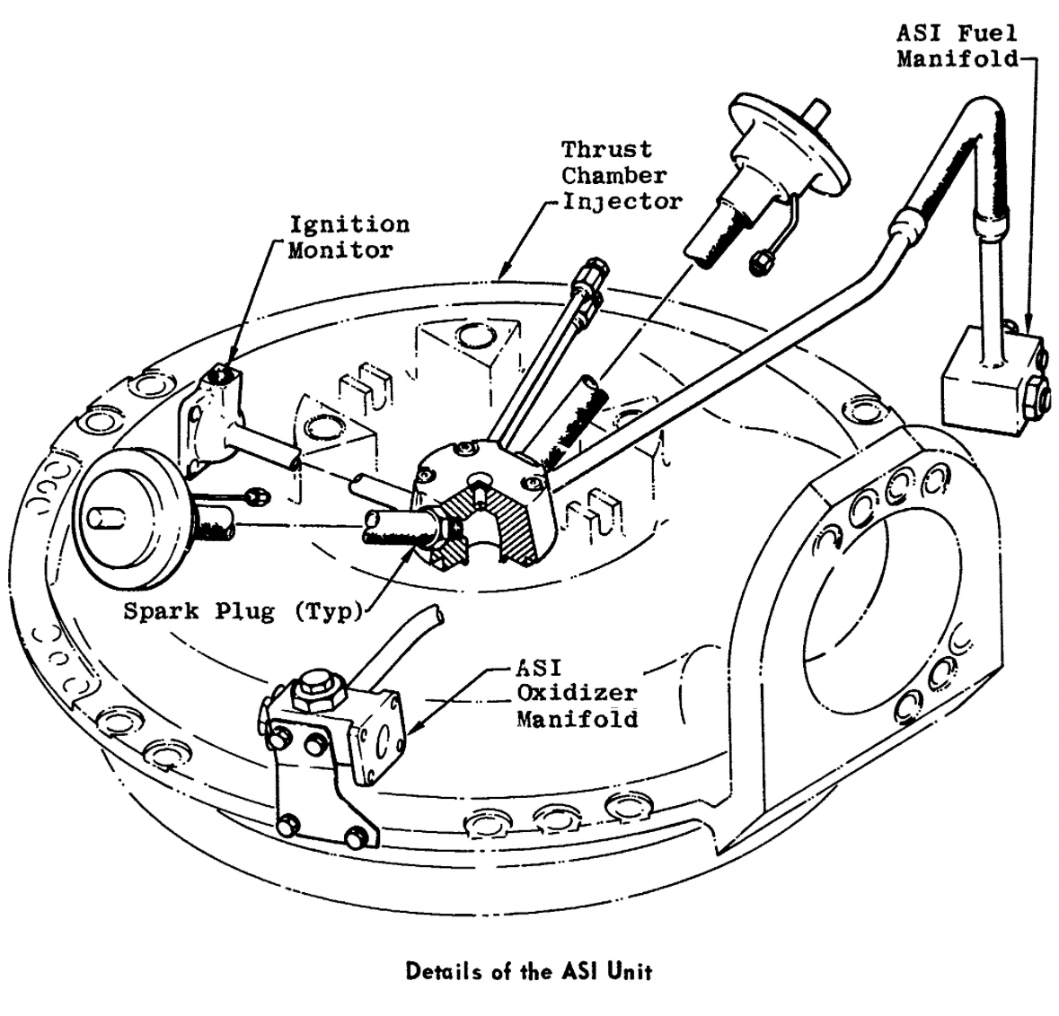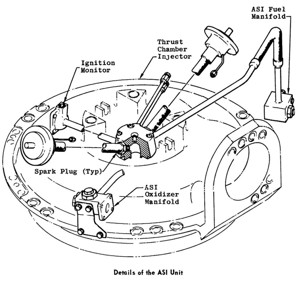 The spark plug can be seen sticking out of the middle ring of the engine. The injector ports are seen in the foreground, one still has a plastic cap covering it. The raised circular port is to mate the engine to its supporting thrust stand shaft as the engine fires upward.