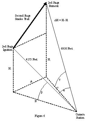 Given the camera Field of View, it is possible to estimate the included angle of the second stage smoke trail. Thus, if the smoke trail is measured as 2.62” in length on a projection in which the horizontal dimension is 9”, then if the 9” dimension corresponds to a 30.6° FOV, the smoke trail must be 8.9° in angular dimension. This analysis indicates that the included angle of the smoke trail is between 8.1° and 8.9° as seen from the camera (this is the angle ? in Figure 6).